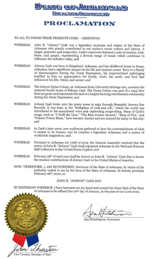 John R. "Johnny" Cash bol legendárnym hudobníkom a občanom štátu Arkansas, ktorý významne prispel k hudobnej kultúre a histórii nášho národa. Spevák, gitarista a skladateľ Cash mal v repertoári zmes country, rocku, blues a gospelu, a reprezentuje tak rozmanitú škálu hudby, ktorá dodnes ovplyvňuje toto odvetvie, a
