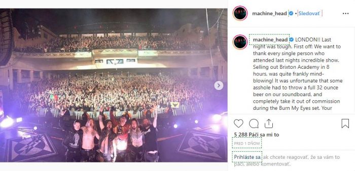 "Nanešťastie, nejaký sráč nám vylial celý liter piva na aparatúru a kompletne ju vyradil počas Burn My Eyes (Machine Head je na šnúre pri príležitosti 25. výročia vydania rovnomenného debutu). Vaša trpezlivosť aj rešpekt počas tejto 20-minútovej katastrofy boli obdivuhodné a patrí Vám za to vďaka."